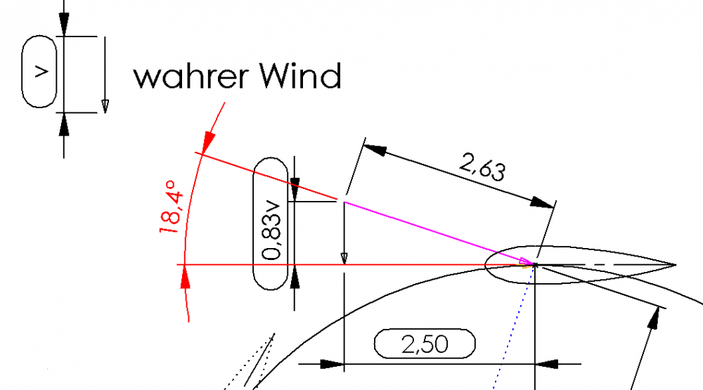 Wenn im Punkt höchster Dicke befestigt, also hier bei 30%, so ist das nahe dem Druckpunkt (bei 25%). Und da sieht das mit der Anströmung schematisch so aus (TSR 2,5):
