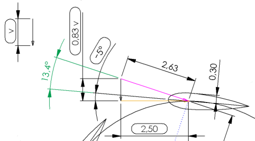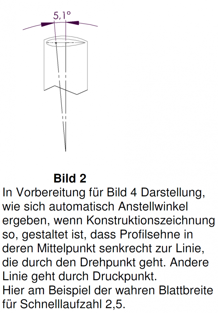 Das Blatt ist hier zwar waagerecht. Es kommt aber auf den Winkel zwischen Profilsehne und Radiuslinie zum Druckpunkt (hier. bei 25%) an. Der ist hier nur 85°. Entspricht einem Blatteinbau mit 5° Neigung, hinten nach innen.