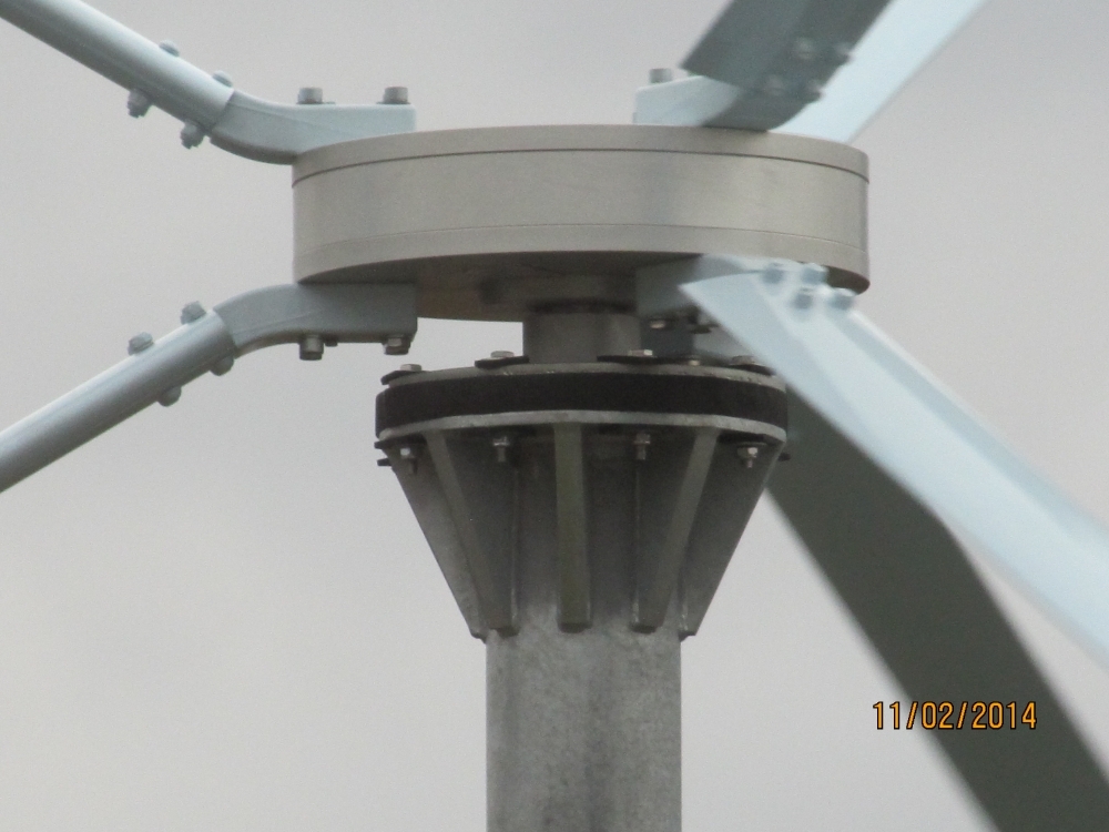 Ich fürchte das größte Problem wird, einen so großen Darrieus sturmsicher zu machen. Die Rotorblätter werden sehr leicht aus CFK gebaut mit beispielsweise einem 10mm CFK-Rohr im Schwerpunkt auch als Befestigungspunkt für den Tragarm, in 1 m Abstand den 2. Tragarm. Befestigt mit Igus Kunststoffgelenkkopf ( Tragkraft rad. 1500 N ). Ich hatte inzwischen mehrfach mit gesteuerten Darrieus experimentiert ( Exzentergetriebe oben drauf ) aber das waren lauter instabile Klapperatismen, nicht Alltagstauglich. Dabei hat sich aber die Bauweise der Tragfläche mit eingelegtem Rohr als Versteifung des Rotorflügels und Gelenkbefestigung der Streben bewährt. In dieser Bauart möchte ich nun eine Sturmsicherung bauen.