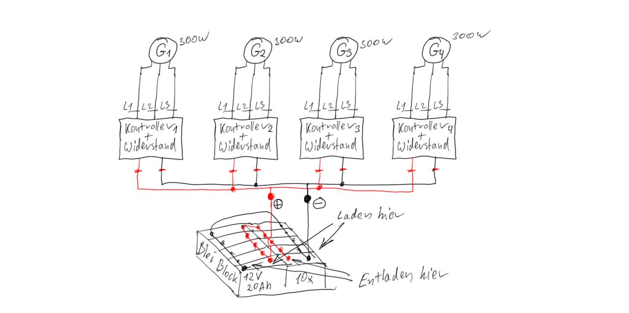 Mir ist klar dass ich die Generatoren nicht alle an einen Controller anschließen kann und deswegen würde ich zu passender Anzahl je Generator einen Chinacontroller einbauen. Die Ausgänge dann bündeln und an den Batterieblock klemmen.