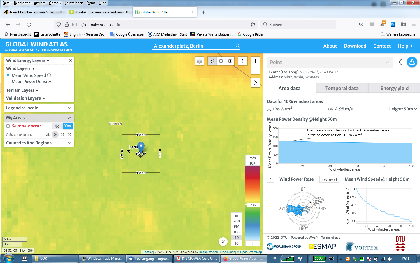 Mal im Globalwindatlas "Berlin, Alexanderplatz" eingetragen. In 50m Höhe, auf Hochhäusern also, 4,85 m/s bzw. in den 10% der windigsten aeras im 3x3 km-Quadrat drumrum bis 4,9 m/s.