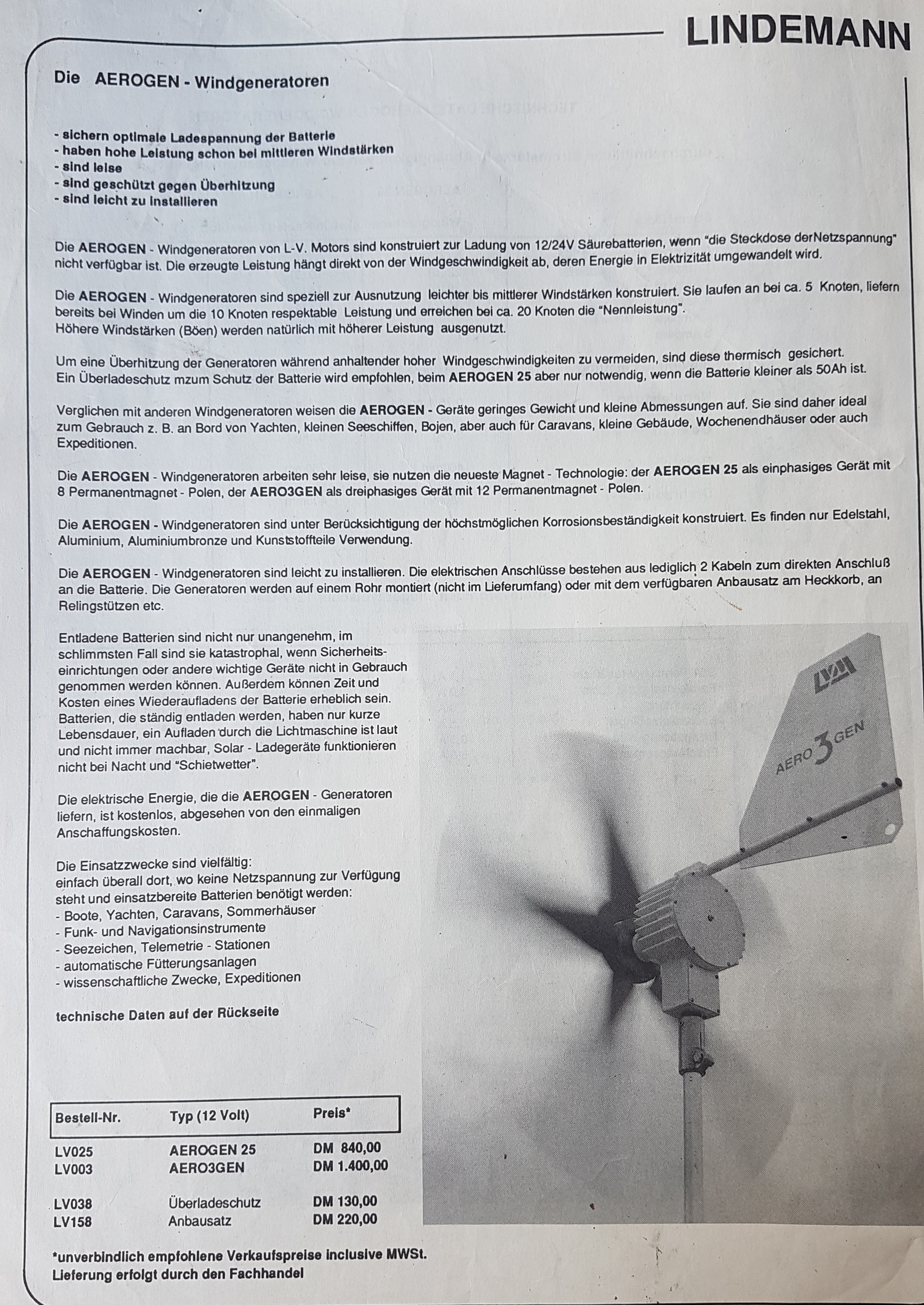Mein Vater hat diesen Windgenerator so wie er ist, auf einem Boot betrieben. Er liefert aus zwei Kabeln 12V Gleichstrom und hat auch eine Überhitzungssicherung.