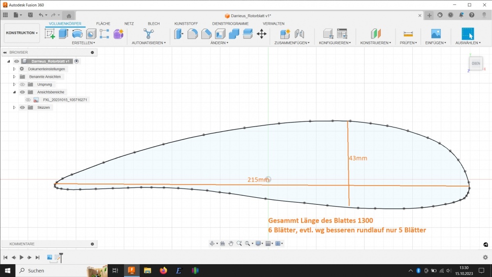 Ich hab rel. günstig 6 Rotorblätter erstanden, Länge 1300mm 6 Stk sie anbei Skize Profil und Bemasung.