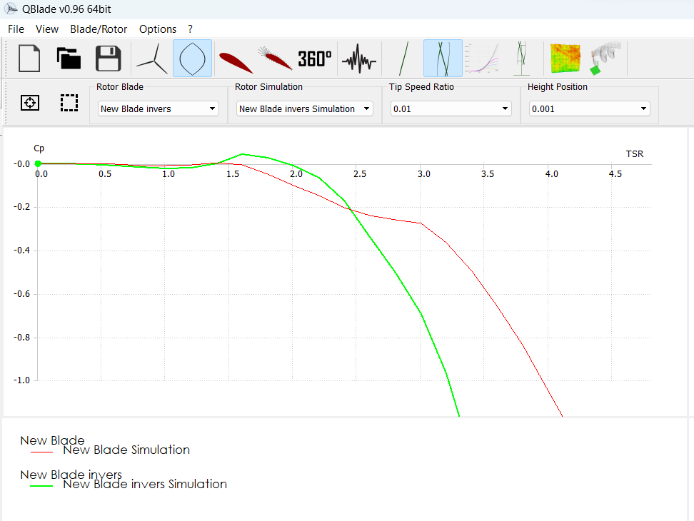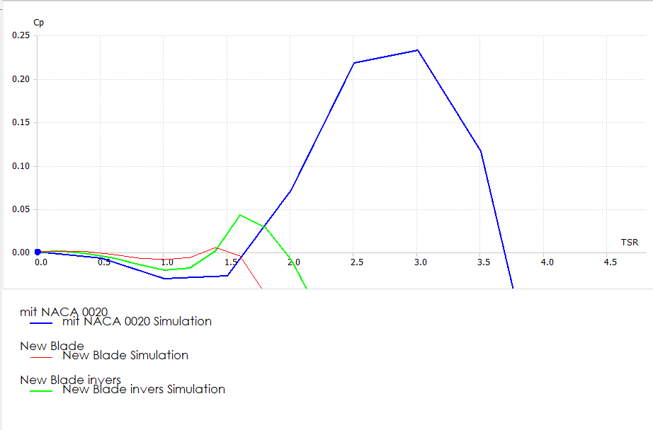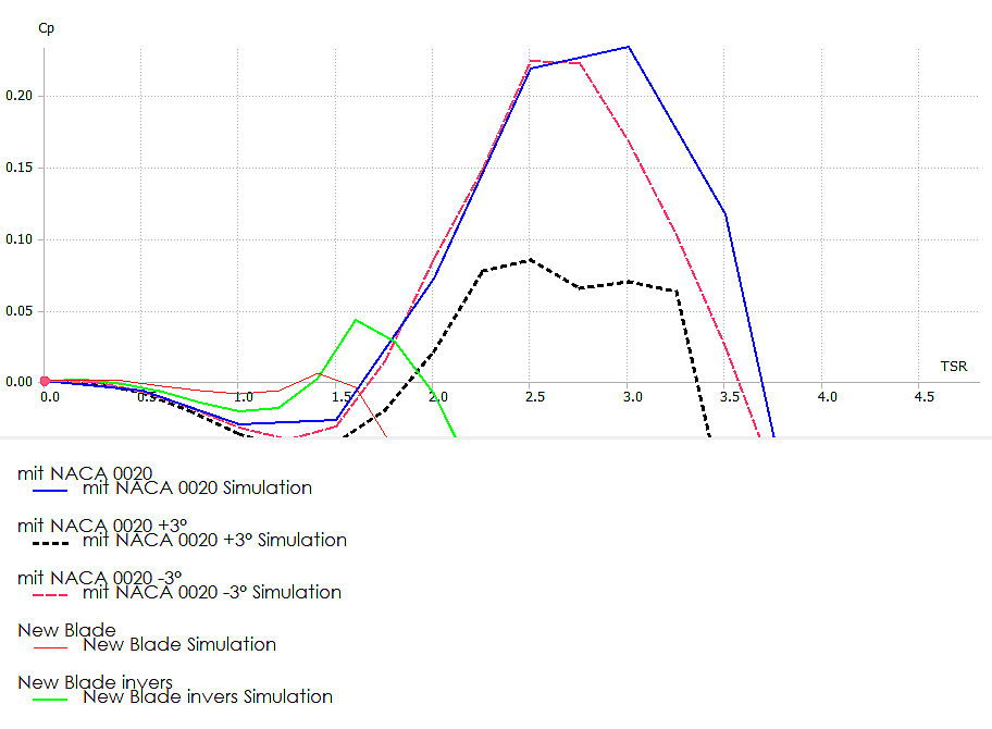 Um dem Vorwurf vor zu beugen, das Pragramm könne nicht simulieren, der selbe Rotor nochmal mit NACA 0020 Blättern, im Abstand von TSR 0,5 simuliert.