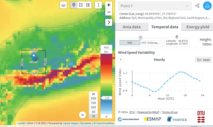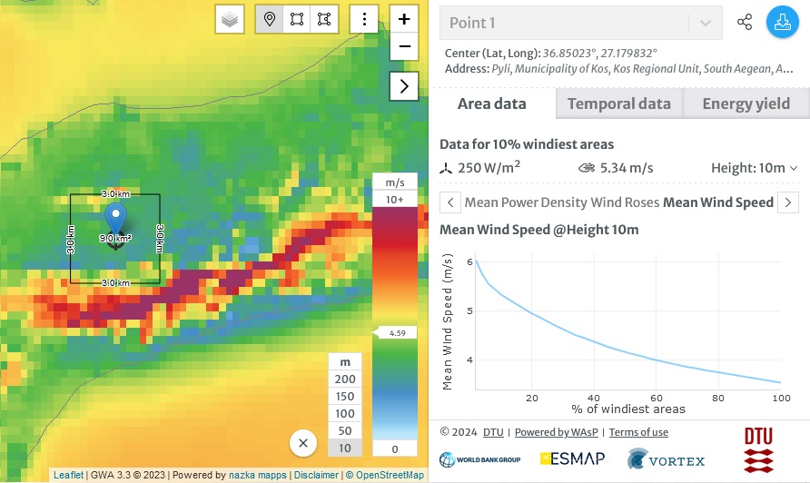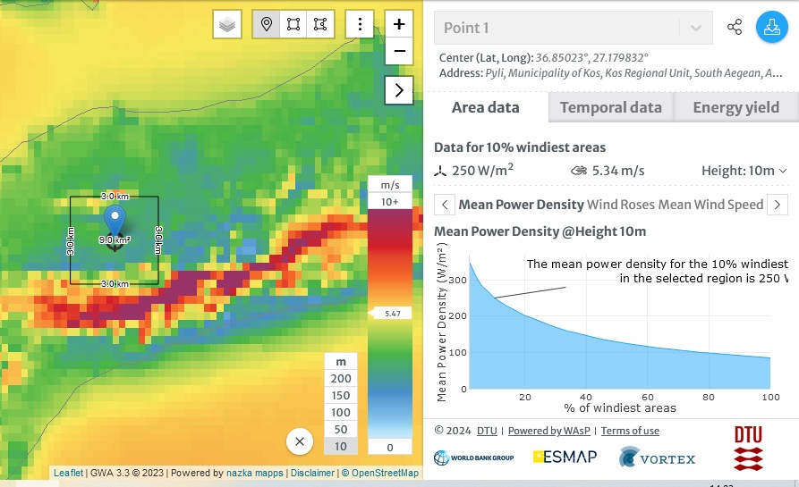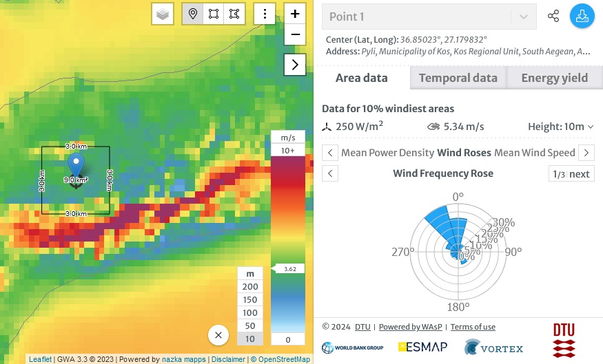 Die Insel Kos hat nur auf dem Gebirgsrücken Jahresmittelwinde im roten Bereich! Siehe 2. Anhang.