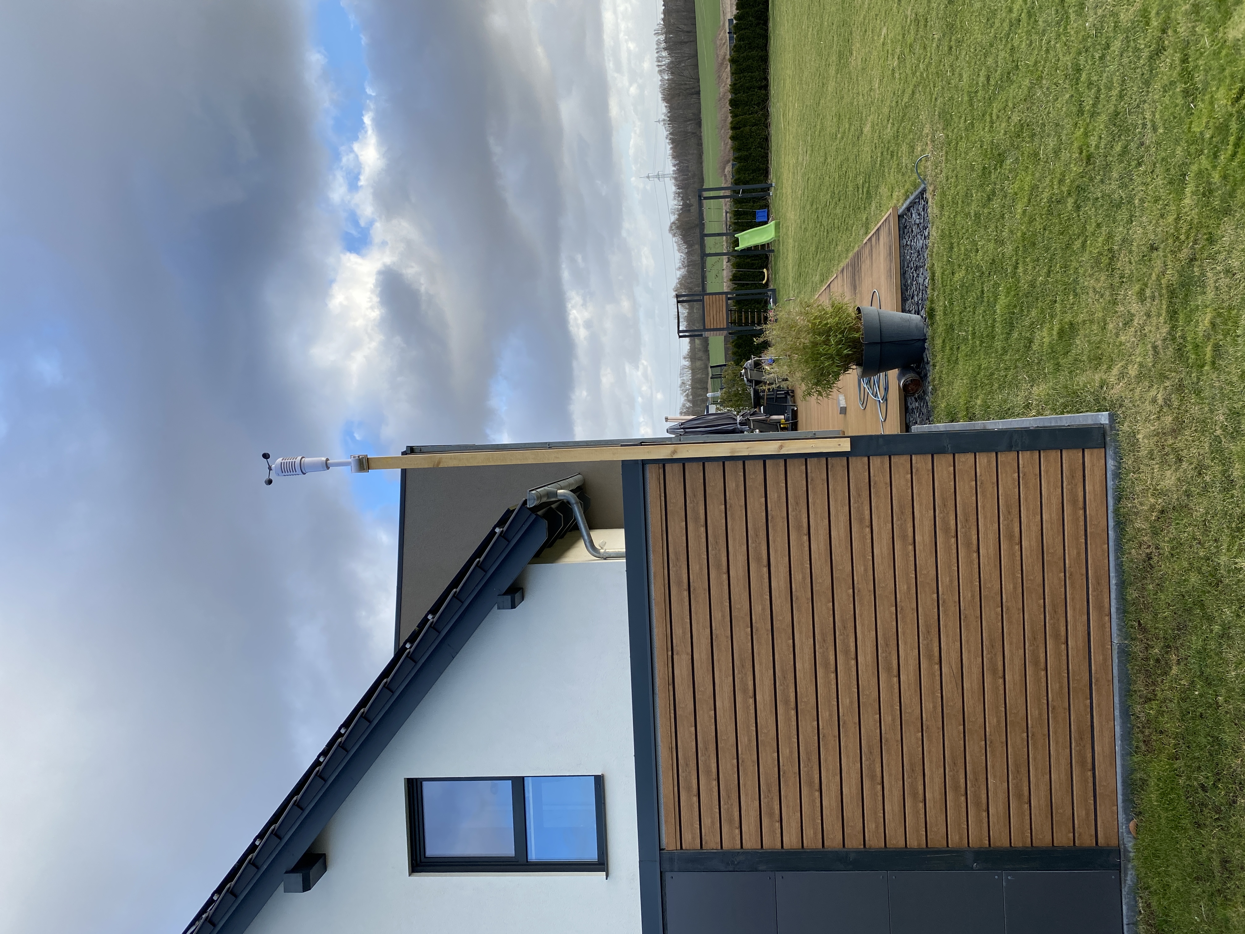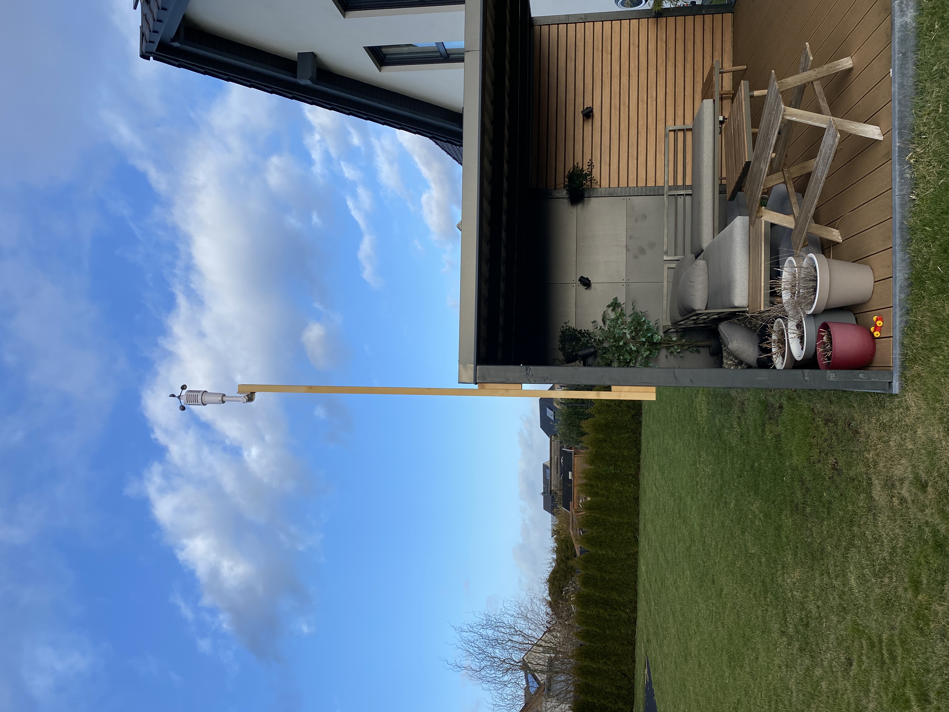 Anbei seht ihr auch den Standort. Die hauszugewandte Seite ist relativ egal, da von dort eh nie Wind kommt. Im Prinzip ist meine Idee, den Mast am Pavillon zu befestigen, um das Drehmoment abzufedern.