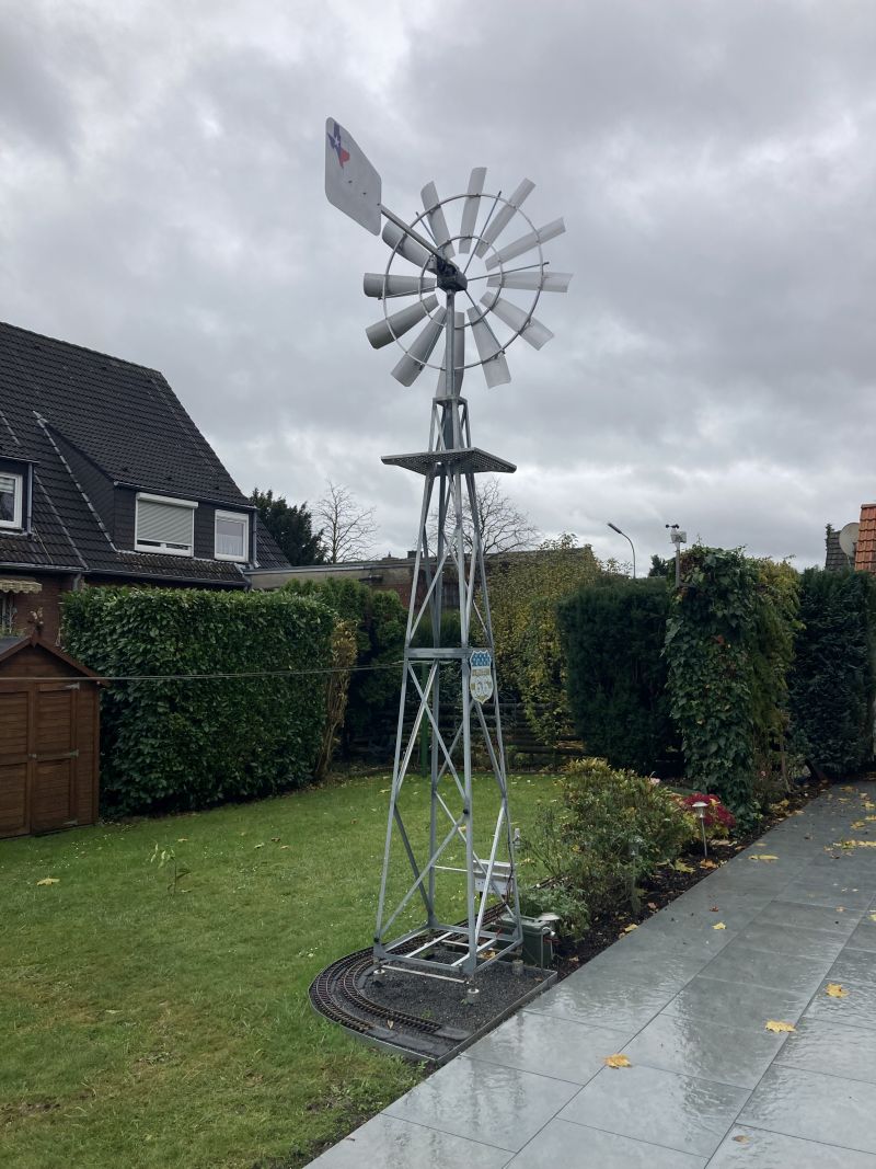Gute Idee mit dem Spielzeug, ist es ja auch für mich, allerdings hat es schon ganz schön Kraft, wenn es richtig dreht. Die Rotorvergrößerung hat schon richtig was gebracht. laut ist es wirklich nicht, procktisch gleich Null, nur ab und zu gibt es ein leichtes "Scheppern", so als wenn Blech etwas schwingt. Das ist allerdings für die Nachbarn kaum Hörbar. Einzig was vielleicht etwas störend wirkt ist der Schattenschlag des Rotors, wenn die Sonne ihn trifft, da die Drehzahl ja nur zwischen Null und ca. 120 Umdrehungen liegt. Und sicher im Garten sind die Windbedingungen alles andere als gut. Als Anhang mal der aktuelle Stand.