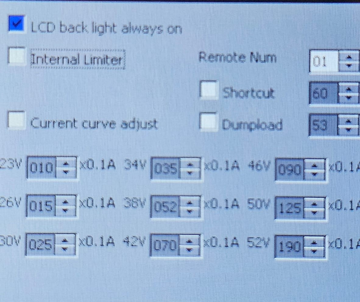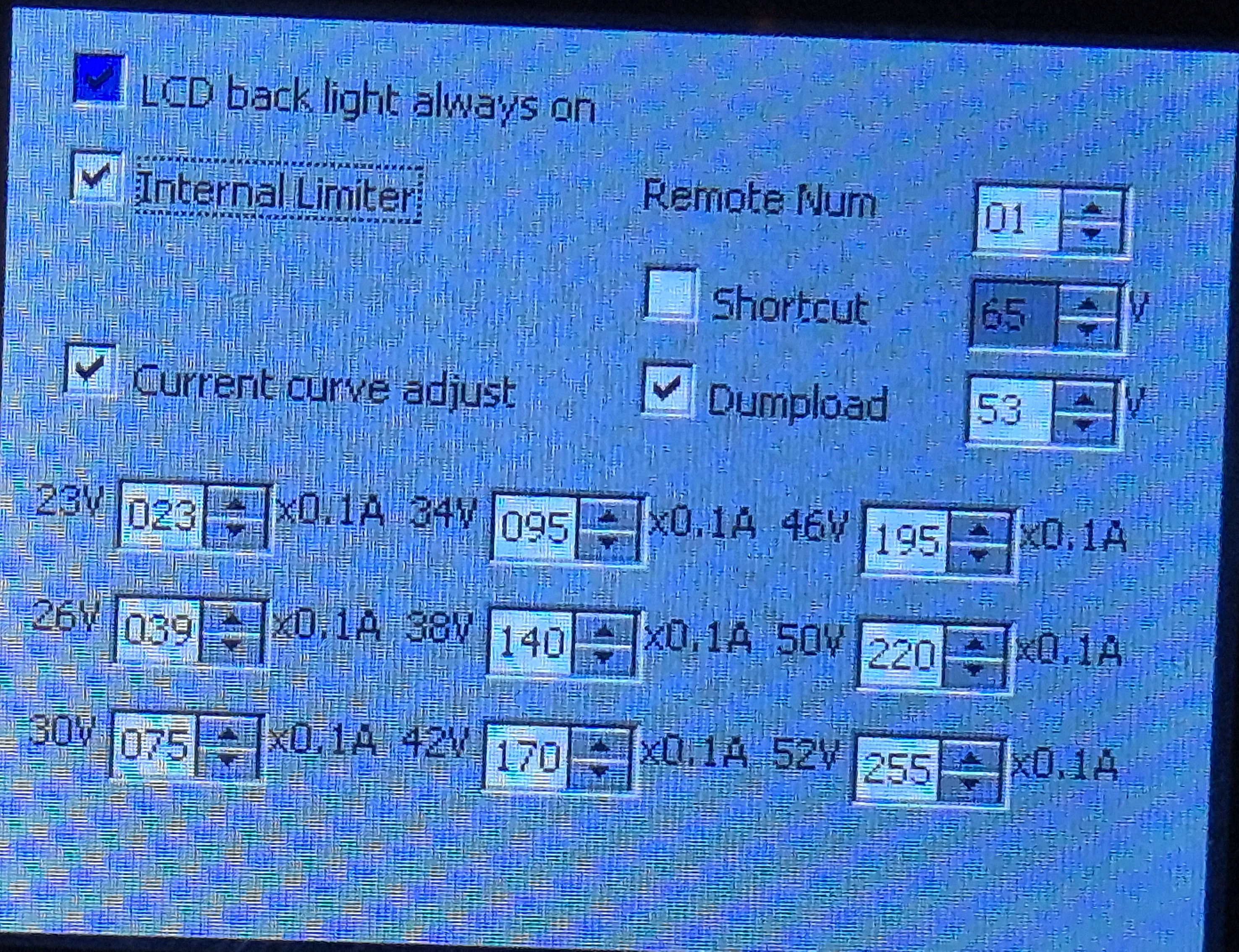 OK vielen Dank. Leider ist der Max. Wert bei 52V nur bis auf 255 hochzustellen. Die anderen Werte habe ich nur ungefähr eingestellt, müssten bestimmt noch besser angepasst werden. Siehe Anhang. Also scheint der WR tatsächlich nur die ca. 200 Watt zu schaffen.