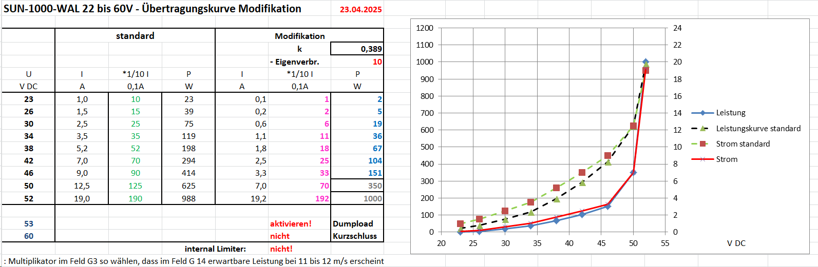 Habe dazu die für den hiesigen Savonius vorgeschlagene Übertragungskurve eingepflegt, und zuvor noch die für mein Eigenbauwindrad, ähnlich Black 600-24V, dafür 2 Kennlinien-Versionen.