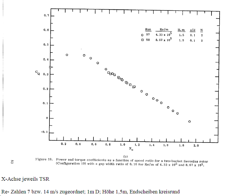 Normalwindräder werden bei zu viel Last durch Strömungsabriss abgewürgt. Der Savonius aber hat bei TSR kurz vor Null das größte Drehmoment, wie folgende Grafik zeigt.