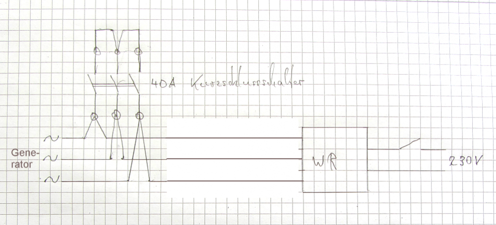 Bei Normalwindrädern ist am Eingang ein Kurzschlussschalter zum Handstop sinnvoll, der hier vielleicht auch nur 20 A haben kann (Paketschalter).